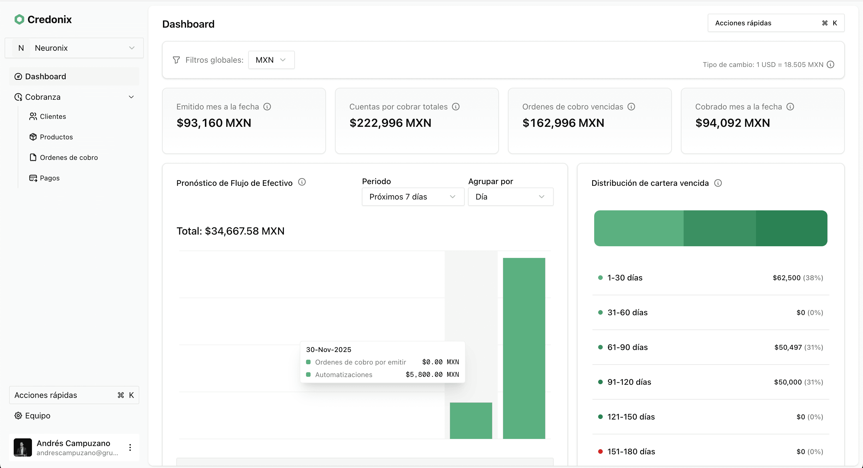 Ya sea que manejes una empresa chica o un negocio en expansión, Credonix te da la organización y automatización que necesitas para simplificar tu cobranza.